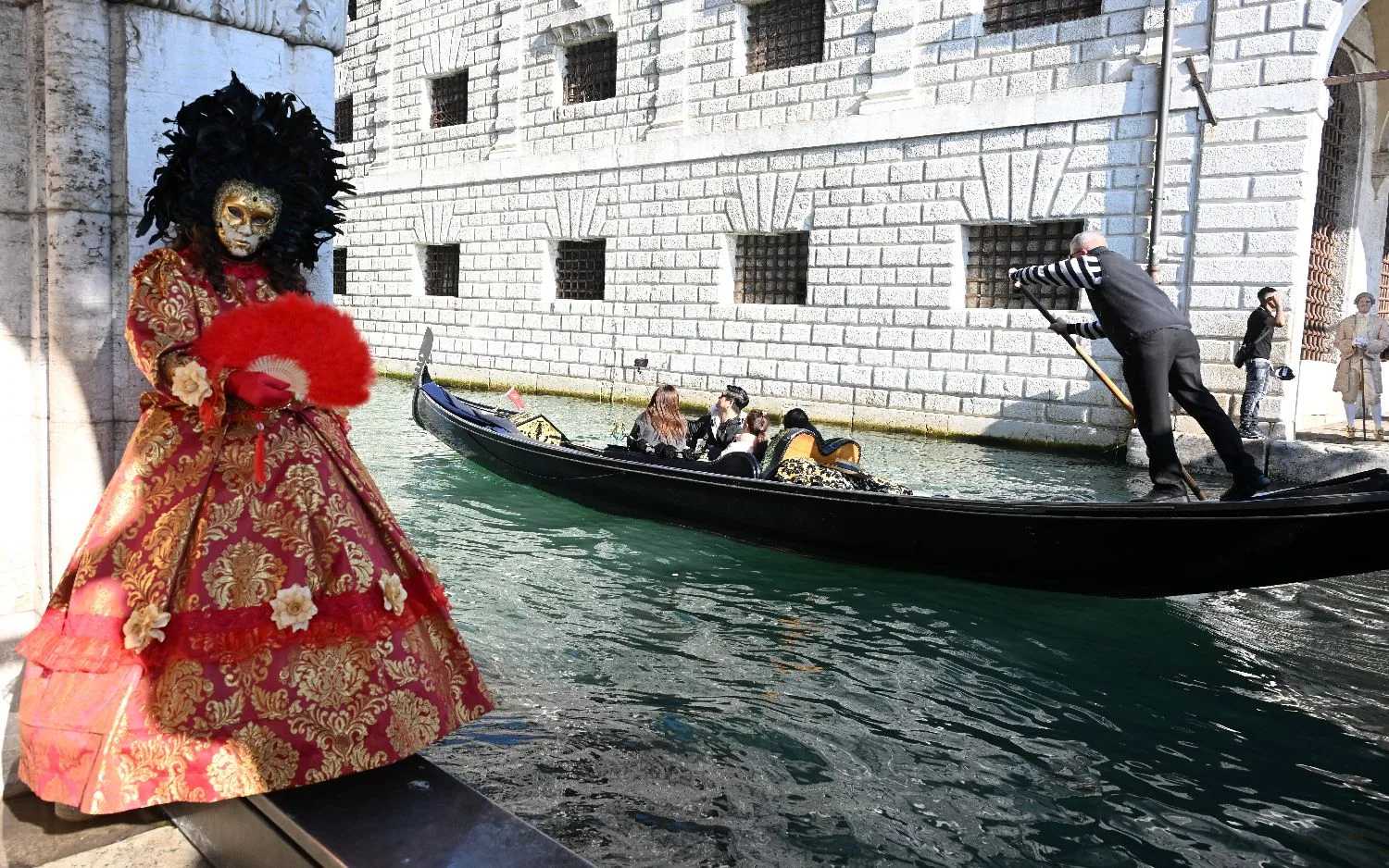 1月31日,在意大利威尼斯,一名狂欢节参与者在运河边与“贡多拉”船合影。