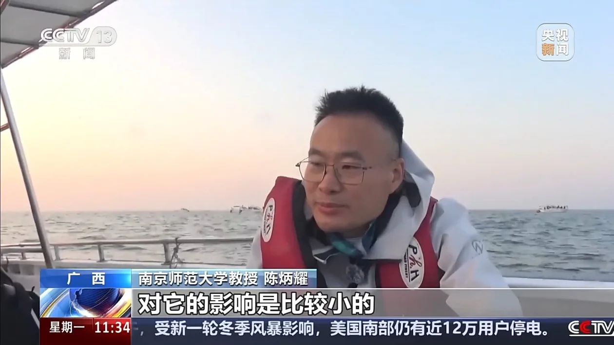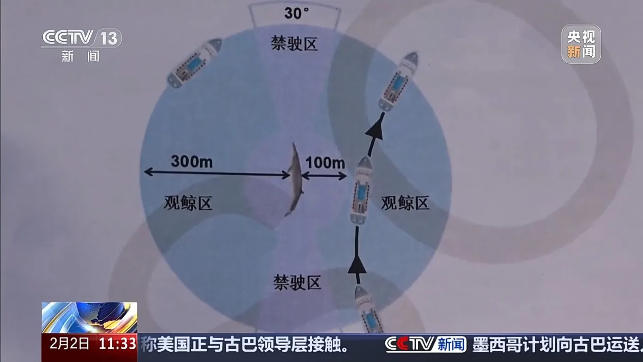 南京师范大学教授 陈炳耀:一般要求这个观鲸船离这个鲸要在100米以外。这是国际通用的标准,也是经过验证,100米之外,对鲸鱼的影响是比较小的,是可以接受的。