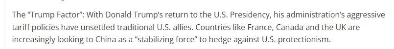 文章说,美国政府的强硬关税政策令美国传统盟友感到不安。法国、加拿大和英国等国家正日益将中国视为“稳定力量”,以对冲美国保护主义带来的风险。