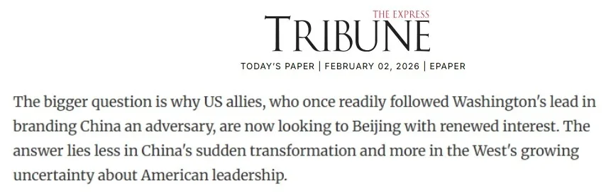 巴基斯坦《论坛快报》2日的一篇文章指出,为何曾紧跟华盛顿将中国视为“对手”的西方盟友们,如今对中国重燃兴趣?答案不是中国的突然转变,而是西方对美国不确定性日益加深的疑虑。