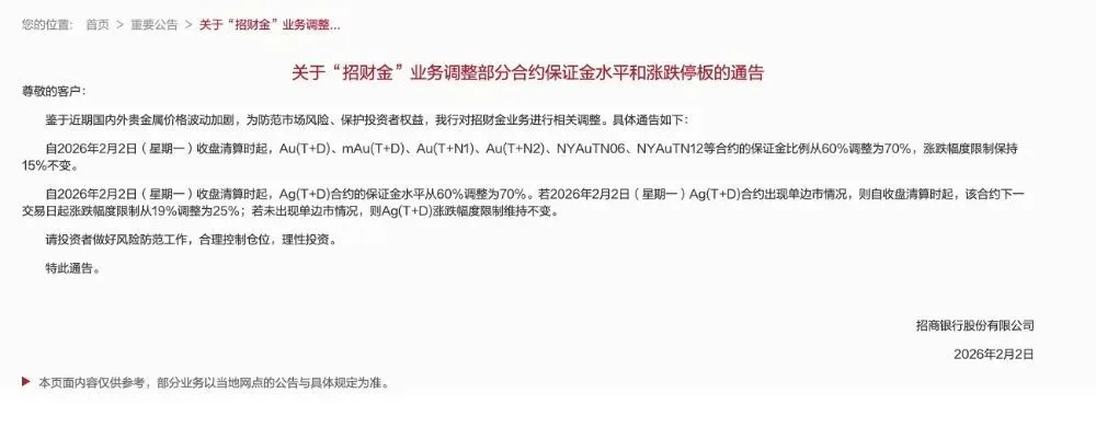 同日,招商银行发布公告表示,鉴于近期国内外贵金属价格波动加剧,为防范市场风险、保护投资者权益,招行对“招财金”业务进行相关调整。自2026年2月2日(星期一)收盘清算时起,Au(T+D)、mAu(T+D)、Au(T+N1)、Au(T+N2)、NYAuTN06、NYAuTN12等合约的保证金比例从60%调整为70%,涨跌幅度限制保持15%不变。自2026年2月2日(星期一)收盘清算时起,Ag(T+D)合约的保证金水平从60%调整为70%。若2026年2月2日(星期一)Ag(T+D)合约出现单边市情况,则自收盘清算时起,该合约下一交易日起涨跌幅度限制从19%调整为25%;若未出现单边市情况,则Ag(T+D)涨跌幅度限制维持不变。同时,招行请投资者做好风险防范工作,合理控制仓位,理性投资。