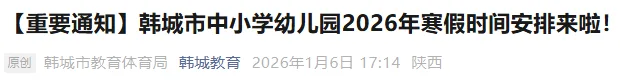 为让大家提前做好假期规划,根据相关工作部署,现将韩城市中小学、幼儿园及相关学校2026年寒假放假、收假安排通知如下,请务必知悉并合理安排作息: