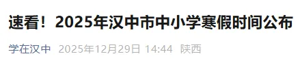 经研究决定,2025—2026学年汉中市义务教育学校寒假从2026年2月2日开始,普通高中学校寒假从2月9日开始;春季学期,小学、初中、高中一二年级3月4日开学报到,3月5日正式上课;高三年级2月24日开学报到,2月25日正式上课。幼儿园、特教学校参照义务教育学校放假时间执行,中等职业学校参照普通高中学校放假时间执行。