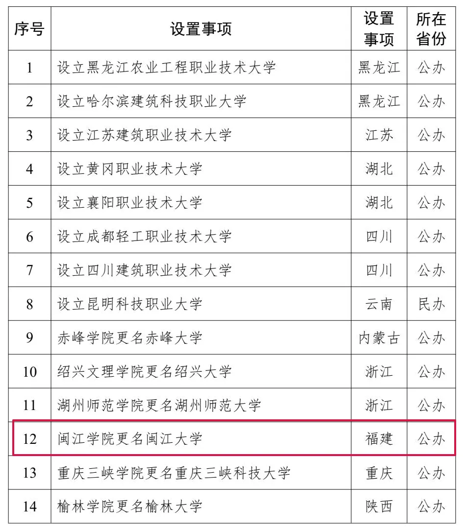 今天,教育部网站发布《关于拟同意设置本科高等学校的公示》,拟同意设置黑龙江农业工程职业技术大学等14所学校,其中,拟同意闽江学院更名闽江大学公示时间为2026年1月12日至1月16日。