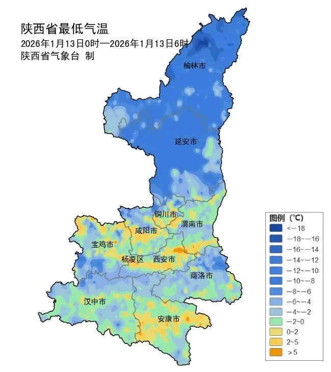 今晨(截至06时)全省共2189个监测站最低气温低于0℃,最低气温分布:陕北-20~3℃,最低神木市锦界镇大树湾站-19.8℃;关中-12~8℃,最低旬邑马栏金盆站-11.9℃,西安站1.4℃;陕南-10~8℃,最低留坝滑雪场站-9.7℃。