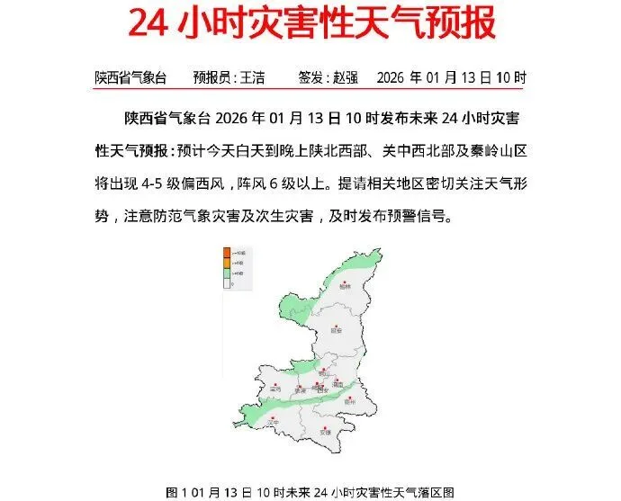 预计今天白天到晚上陕北西部、关中西北部及秦岭山区将出现4-5级偏西风,阵风6级以上。提请相关地区密切关注天气形势,注意防范气象灾害及次生灾害,及时发布预警信号。