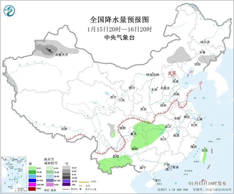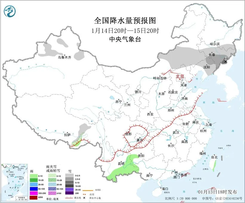 图1 全国降水量预报图(1月13日20时-14日20时)